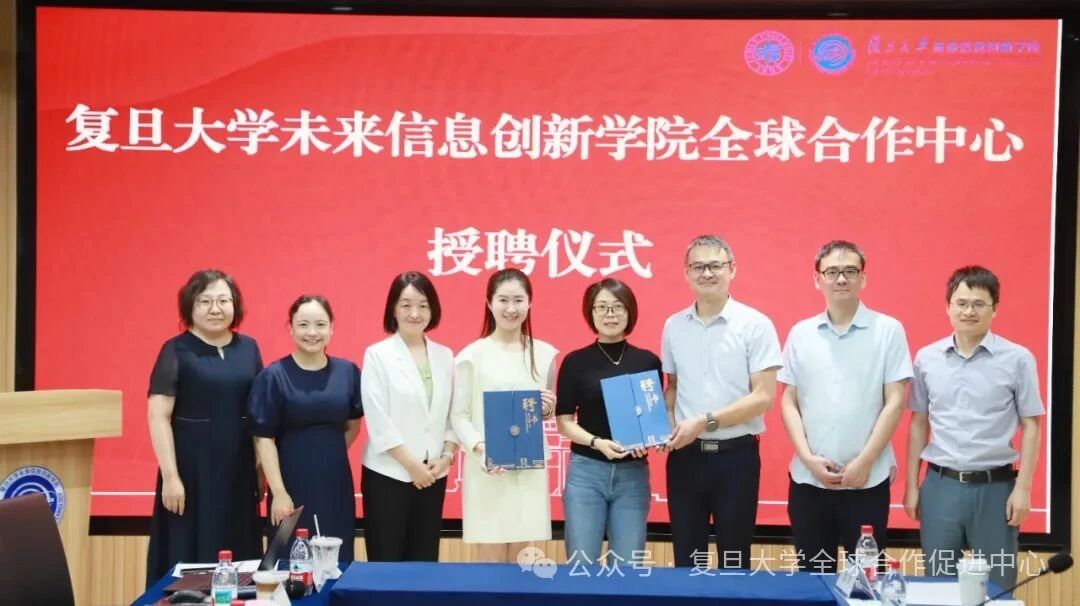 随后,复旦大学全球合作促进中心代表及学院代表共同为学院全球合作中心主任高跃、副主任詹义强、邹卓、张静静、秘书范佳雯、战敏颁发聘书。在学校与学院对中心工作的全力支持下,未来信息创新学院全球合作中心正式启航。